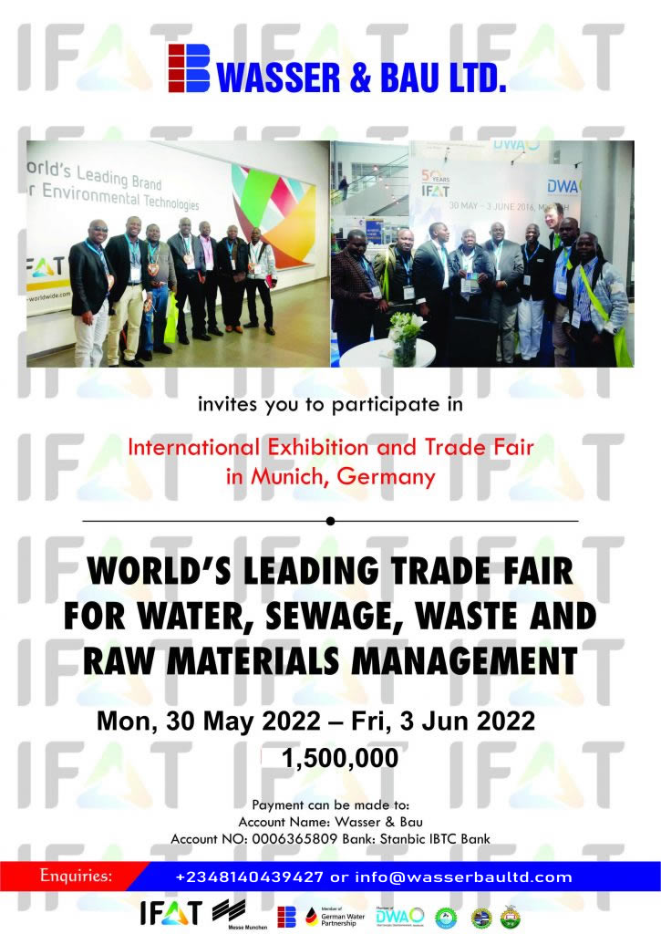 This is to invite the Engineering Community to participate in the World’s Leading Trade Fair for Water, Sewage, Waste and Raw Materials Management in Munich holding from May 30th – 3rd June 2022 at the Messe Munich Germany.