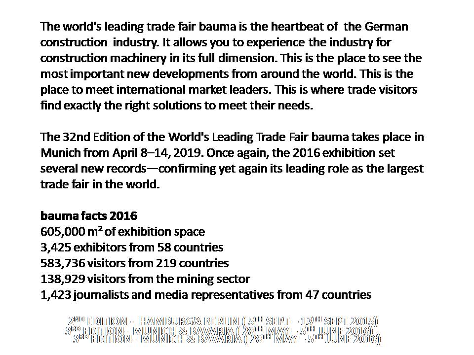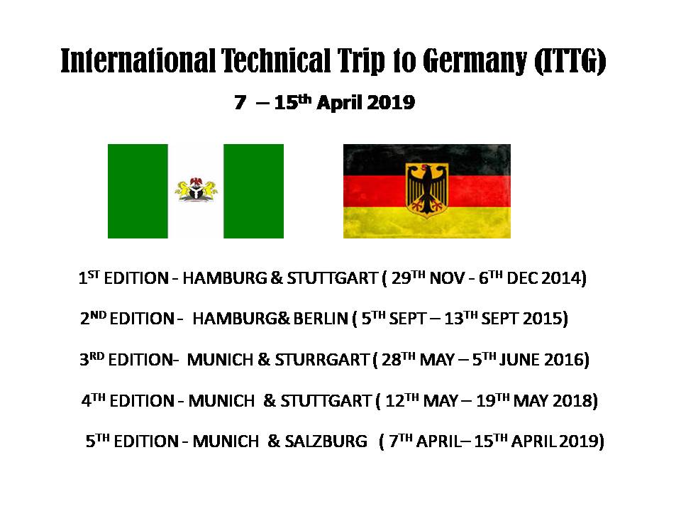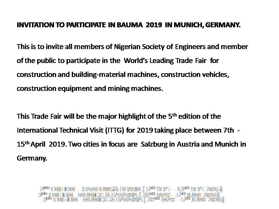 INVITATION TO PARTICIPATE IN THE 7TH EDITION OF INTERNATIONAL TECHNICAL TRIP TO GERMANY (ITTG) BAUMA 2022 IN MUNICH, GERMANY. This is to invite all engineers and engineering practitioners to participate in the World’s Leading Trade Fair for construction and building-material machines, construction vehicles, construction equipment and mining machines. This Trade Fair will be the major highlight of the 6th edition of the International Technical Visit (ITTG) for 2022 taking place between 24th – 30th October 2022. Two cities in focus are Vienna, Switzerland and Munich in Germany. see https://bauma.de/en/ The Bauma (International Trade Fair for Construction Machinery, Building Material Machines, Mining Machines, Construction Vehicles and Construction Equipment) is the world’s largest trade fair in the construction industry. The trade fair, which can be visited by anyone, is held every three years on the grounds of the Neue Messe München and lasts for seven days. The world’s leading trade fair Bauma is the heartbeat of the German construction industry. It allows you to experience the industry for construction machinery in its full dimension. This is the place to see the most important new developments from around the world. This is the place to meet international market leaders. This is where trade visitors find exactly the right solutions to meet their needs.The 33nd Edition of the World’s Leading Trade Fair Bauma takes place in Munich from October 24 – 30th 2022. Once again, the 2019 exhibition set several new records—confirming yet again its leading role as the largest trade fair in the world. Bauma facts 2019 605,000 m² of exhibition space 3,425 exhibitors from 58 countries 583,736 visitors from 219 countries 138,929 visitors from the mining sector 1,423 journalists and media representatives from 47 countries Cities and Places of Visit Salzburg /Vienna (Austria) Switzerland and Munich (Germany) Registration: (15th April – 15th July 2022) For registration and further inquiries, kindly contact Engr. Uche IhunwezeWasser & Bau Ltd Plot 502 Dalaba Street Wuse Zone 5Abuja 08140439427 email: info@wasser-bau.com Cost: One million five hundred thousand naira (₦1,500,000) Package includes – Return Airfare, visa procurement, and accommodation, local transport in Germany, conference fee, and fee for all site visits to various places of importance in Munich. 50% payment is acceptable. Payment of balance made after issuance of Visa. Deadline for Payment 15th July 2022 Application procedure Kindly send your passport data page to info@wasser-bau.com and make to payment to: Payment can be made to Name: Wasser & Bau Ltd Account NO: 0006365809 Bank: Stanbic IBTC Bank In addition to the passport data page, kindly Short CV to ihunwezeu@yahoo.com *Other Side Attraction* Visit to Holocoust Museum in Dacau Visit to Mercedez-Benz Museum in Stuttgart Visit to Olympic Stadium and Allianz Arena in Munich Visit to Vienna Via SalzburgVisit to Switzerland via Zurich Terms and Conditions: 1) In event of visa refusal from German Authority, participants will be refunded 90% of money paid. 2) Participants will choose any of Lagos, Abuja or PH to travel from with Lufthansa. 3) Cost covers all expenses for the trip including breakfast and visa processes, flight, accommodation, transportation within Germany. 4) Wasser and Bau is responsible for all Visa documentation and processing including visa fees but excluding transportation to and fro Lagos. 5)Wasser and Bau will handle all visa documentation processes Enquiries For Registration and further inquiries, kindly send SMS to 08140439427 Package include – Airfare, visa procurement, accommodation, local transport, conference fee, and all site visit to various places of importance in Munich, Switzerland and Vienna. Click below for: EXPRESSION OF INTEREST FORM- bauma 2022 |